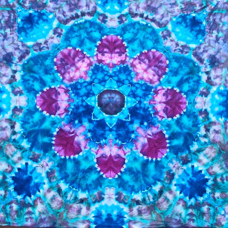 Colour was then built in deliberate layers—deep ocean blues and turquoise forming the base field, with violet and magenta placed to bloom into the petal areas. As the dyes migrated through the folds, they blended and feathered into the soft, cloud-like transitions that give the piece its depth. After curing, the garment was thoroughly rinsed and washed until the pattern revealed itself fully